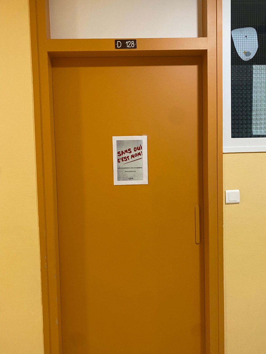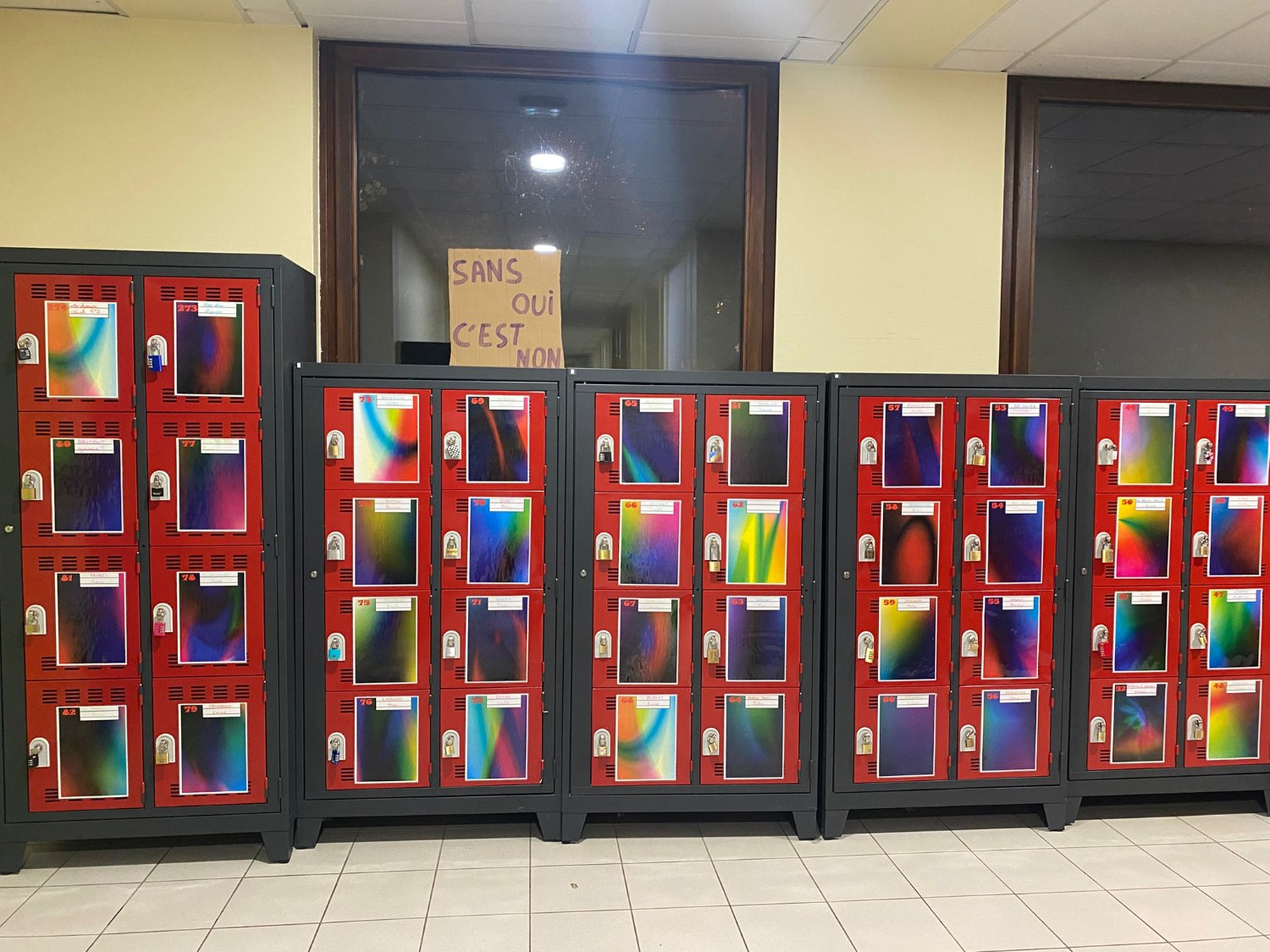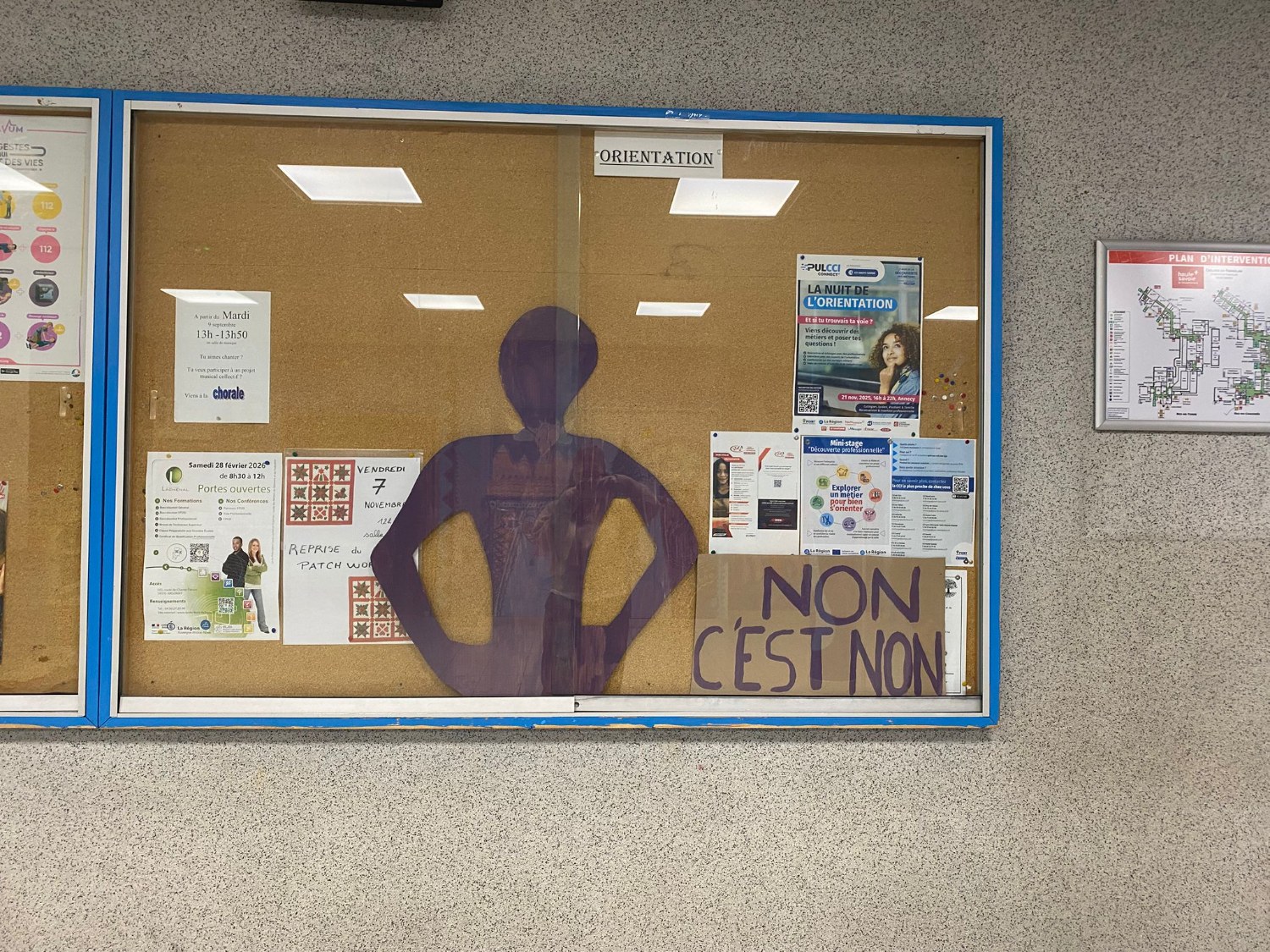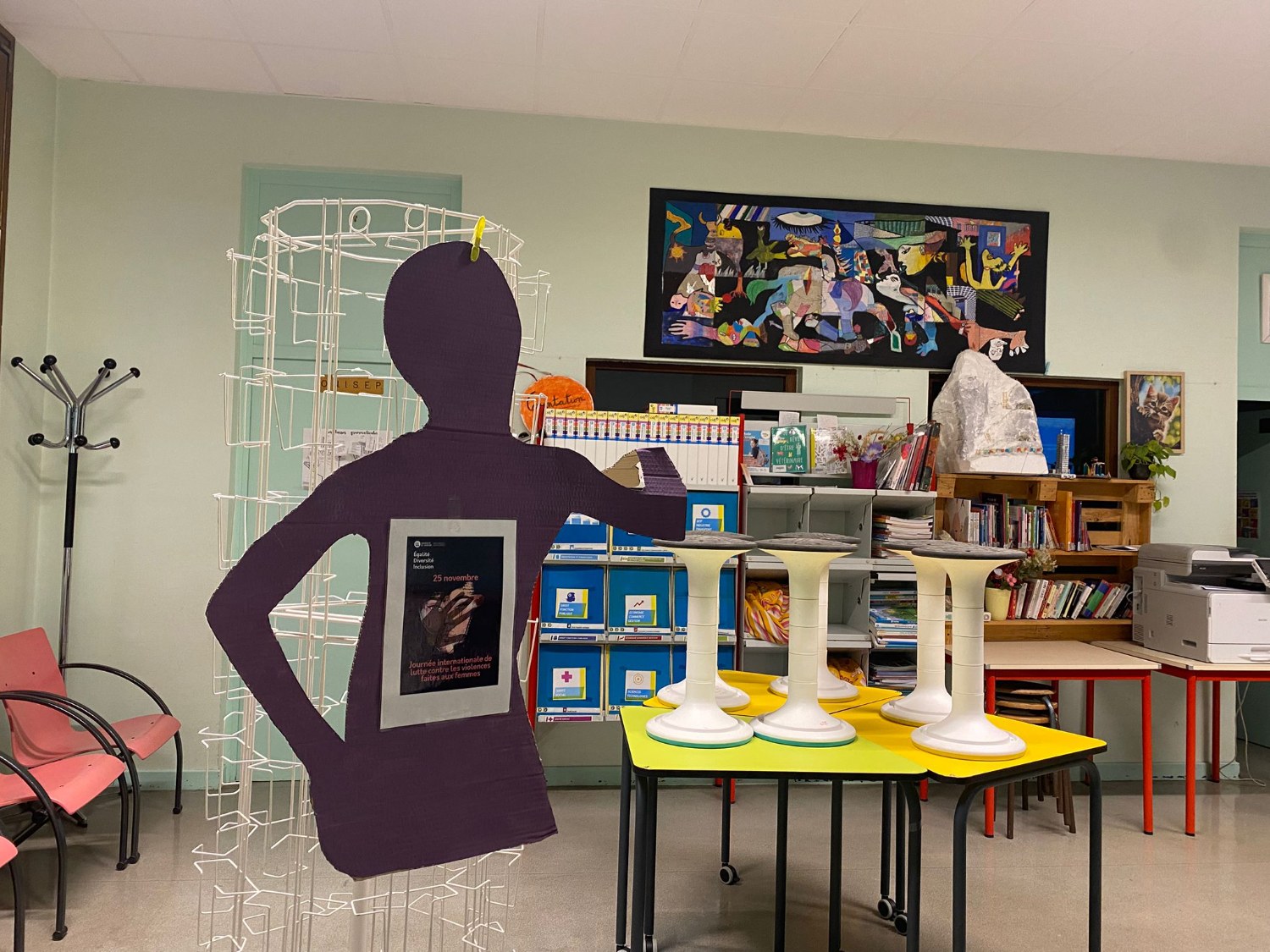 Des silhouettes violettes représentant les victimes ainsi que des affiches et pancartes sur le consentement ont été disposées dans tout le collège.